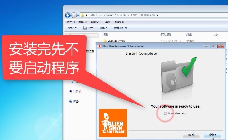 4、安装结束后,复制对应系统的CK目录(32位或64位)中的文件到安装目录覆盖同名文件。安装目录为C:Program FilesAlien SkinExposure 7