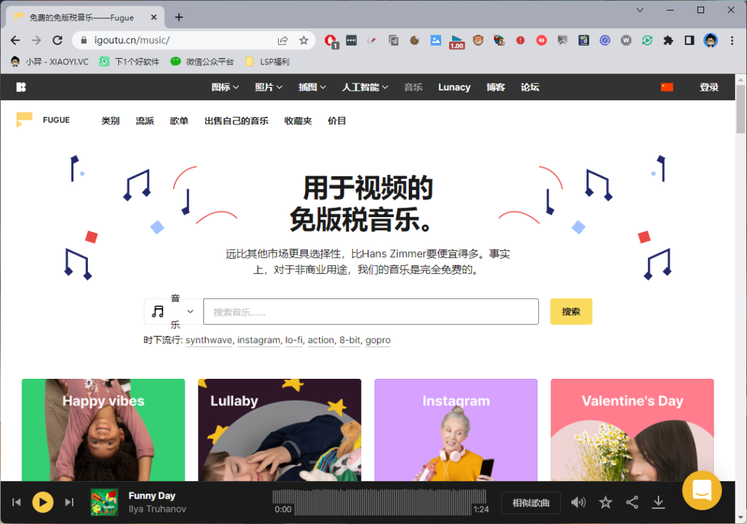 Icons8 提供的免费音乐素材都是免费可商用,不过你也是要注明出处。歌曲都被打上了标签及分类,方便你寻找需要的歌曲素材,另外可以支持下载、在线试听。