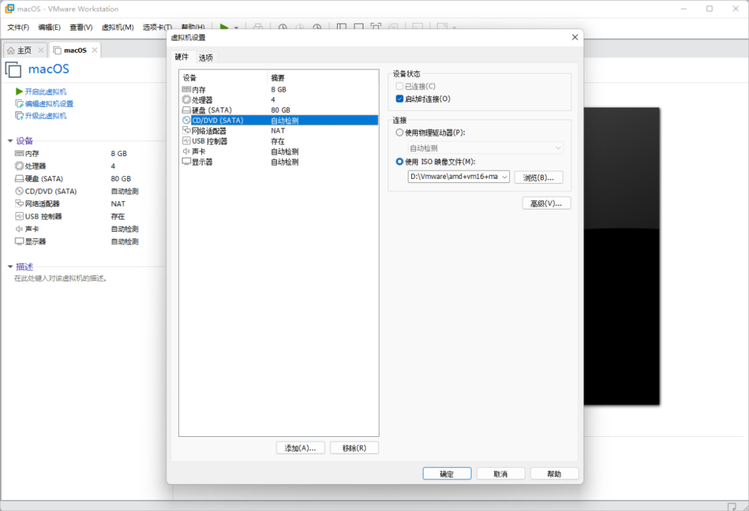 7.点击编辑虚拟机 – CD/DVD设置 – 选择你下载的 macOS 镜像文件,确定后启动虚拟机开始安装。