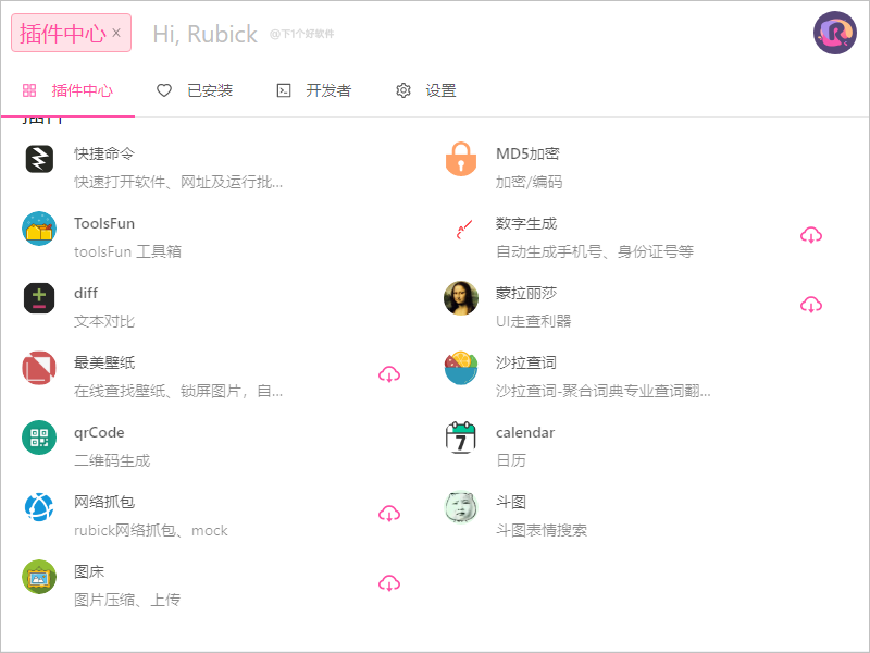 这款 Rubick 软件基于 Electron 开发,所以它支持了跨平台,包括有 Windows、MacOS、Linux 版本。作者表示因为 uTools 没有开源,公司内部的工具库无法发布到 utools 插件中,所以他做了一款类似的快捷启动器,并且开源了,支持安装各种功能插件。