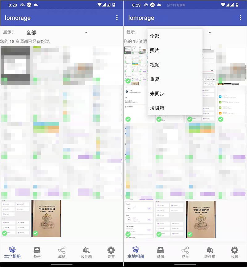 然后下拉相册,就会备份图片到 Windows 服务端上了,你可以筛选你要备份的内容,包括照片、视频、重复、未同步、垃圾箱。