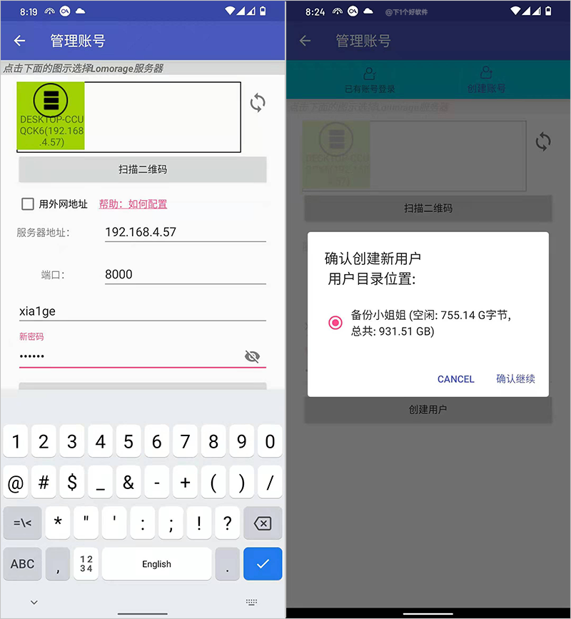 接着手机安装「Lomorage」客户端,通过输入服务器端的 IP 地址,或者扫码二维码的方式登陆访问,在账号管理里面,创建新用户,并登陆,会提示你选择目录位置。