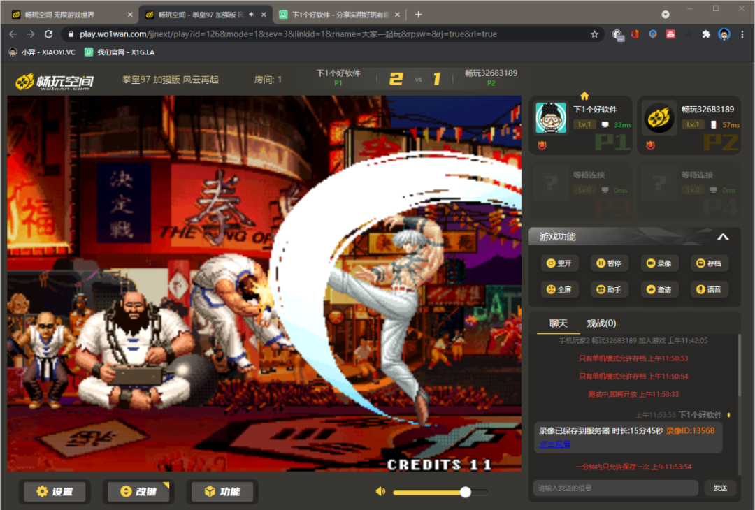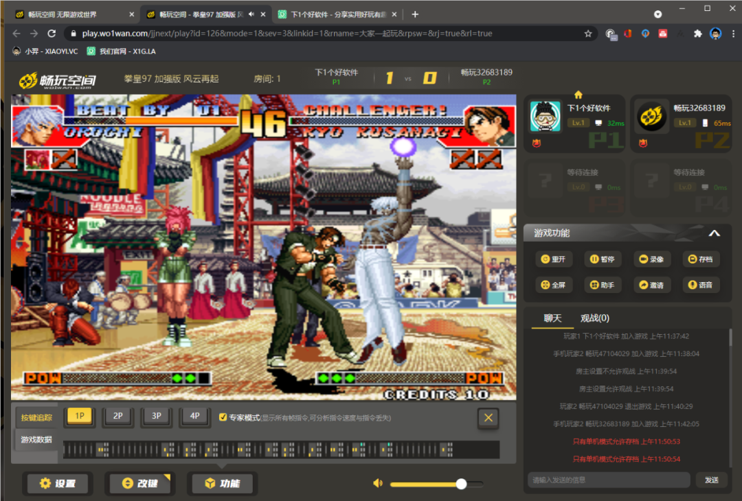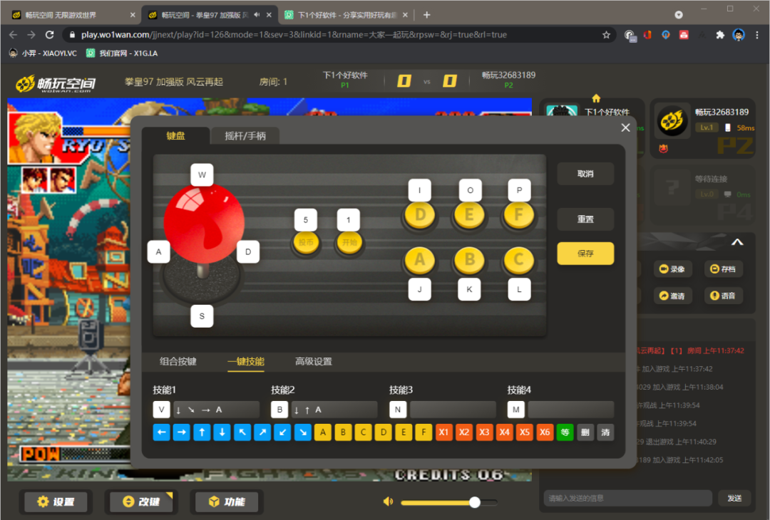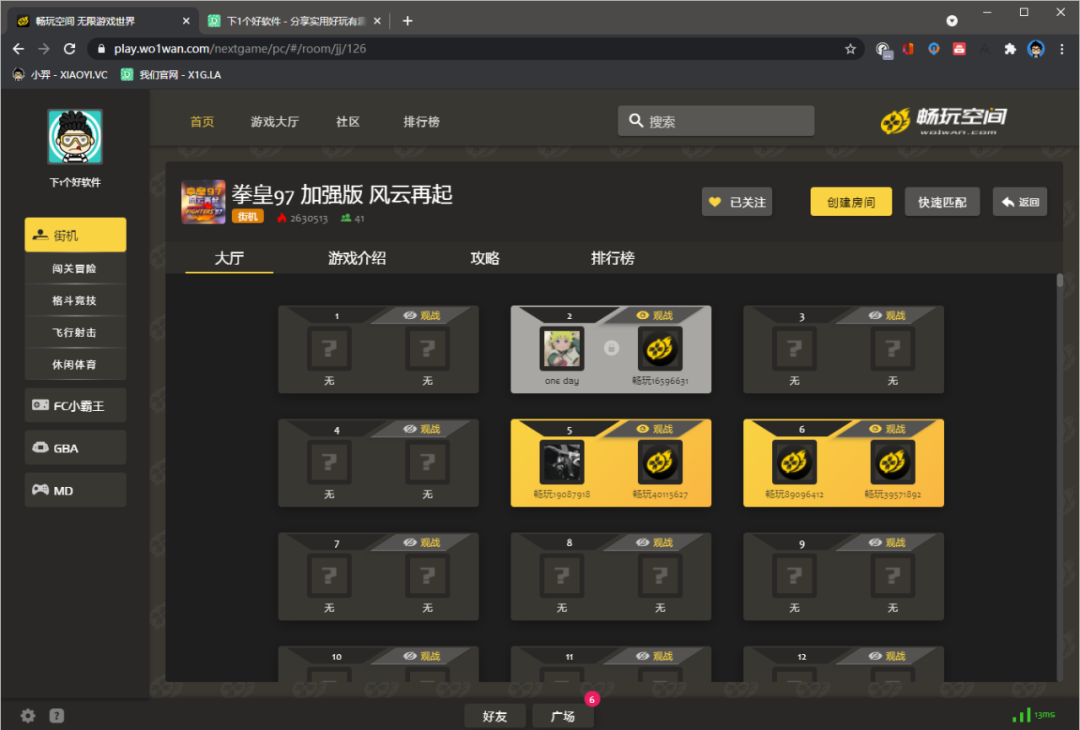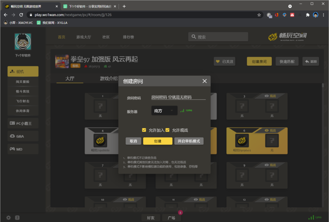 锋哥这里选了一个目前还很火的格斗游戏拳皇97,进入后你可以在大厅选择和其它玩家在线联机对战,也可以自己创建一个房间和单机模式。
