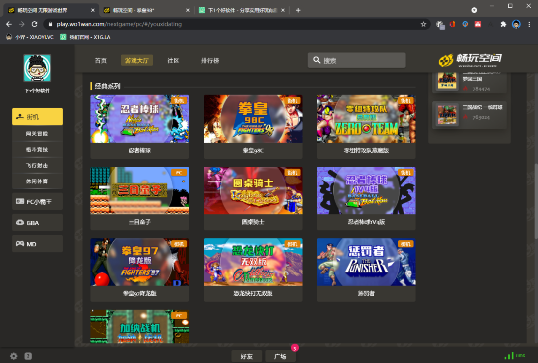 不过现在多个游戏平台已经支持这些街机游戏在线联机了,如果你想重温这些经典游戏,或者想约上当年的小伙伴一起玩,今天锋哥给大家分享一个免费的怀旧经典游戏平台「畅玩空间」内置大量的街机、FC、GBA、MD 等游戏。
