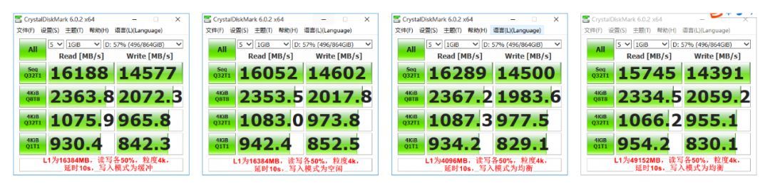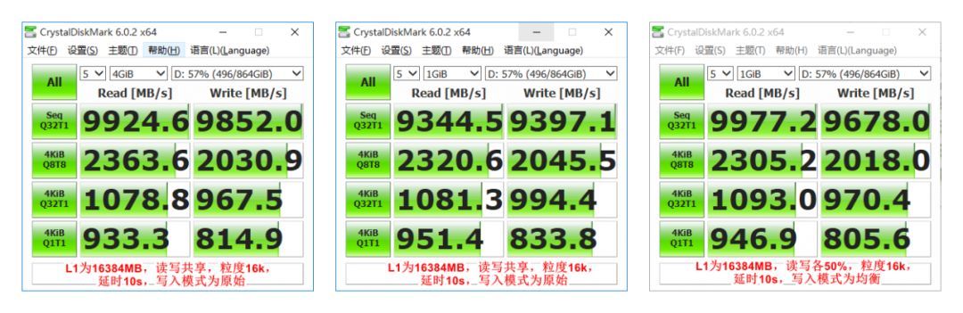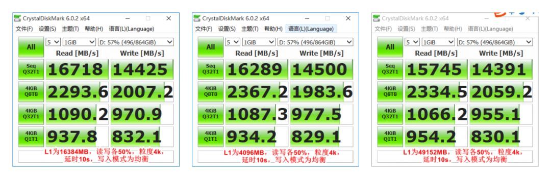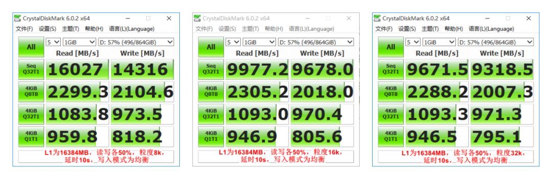 4、缓存粒度为16k,其他设置不同时的影响:可以看出,影响不大,写入模式为均衡时稍微好一点点,“读写分开”比“读写共享”稍微好一点点。