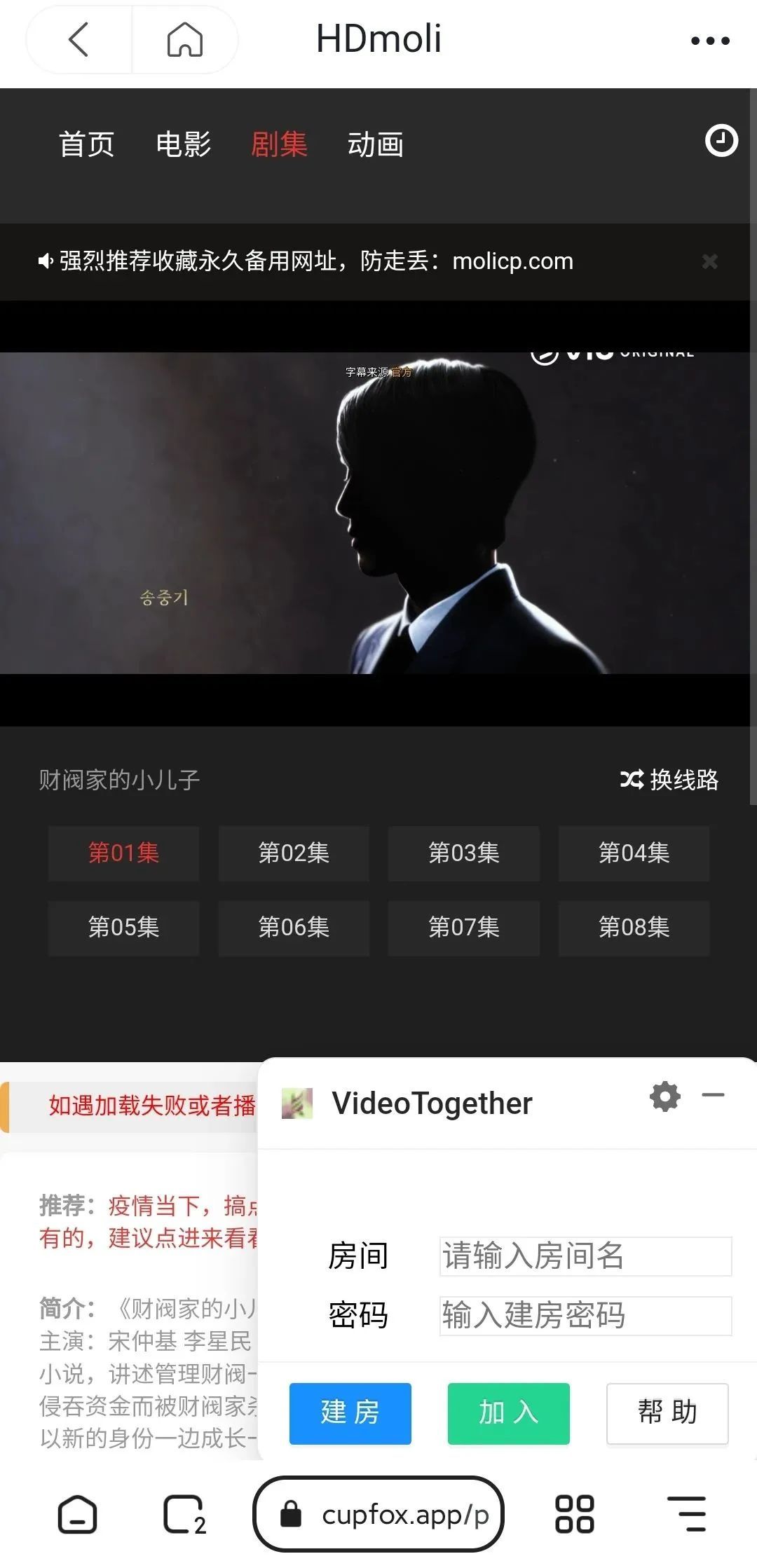 如果你要进入一个房间,只需要输入房主提供的房间名和密码点击“加入”按钮就会自动打开房主正在分享的视频了,某些网站的视频可能需要同样的网络环境。
