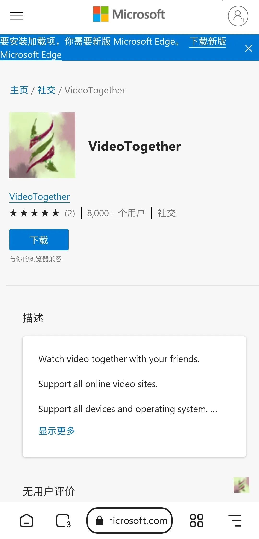 VideoTogether Edge插件商店详情页:https://microsoftedge.microsoft.com/addons/detail/videotogether/eilkilgemogpkebfmhkkapogkiijikli