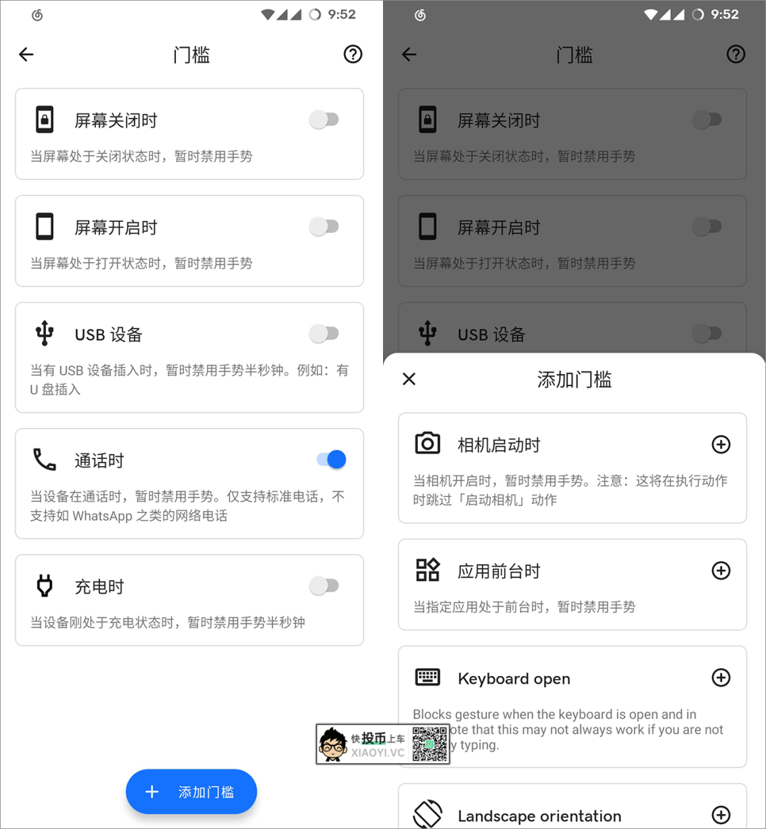 在门槛设置里面你可以选择什么时候才能触发/关闭「Tap,Tap」手势功能,例如你担心玩游戏时容易误触,可以添加指定游戏/APP运行时,关闭手势功能。