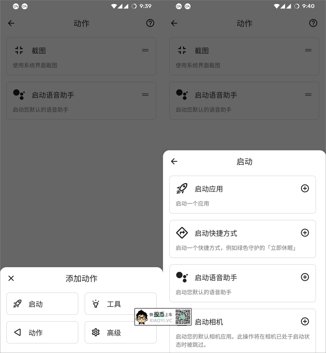 添加手势动作,这里「Tap,Tap」提供了四种项目:启动、动作、工具、高级。每个项目菜单里面可以根据自己需求添加动作,例如触发启动应用、控制音乐播放、唤醒设备、锁屏等等。