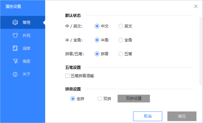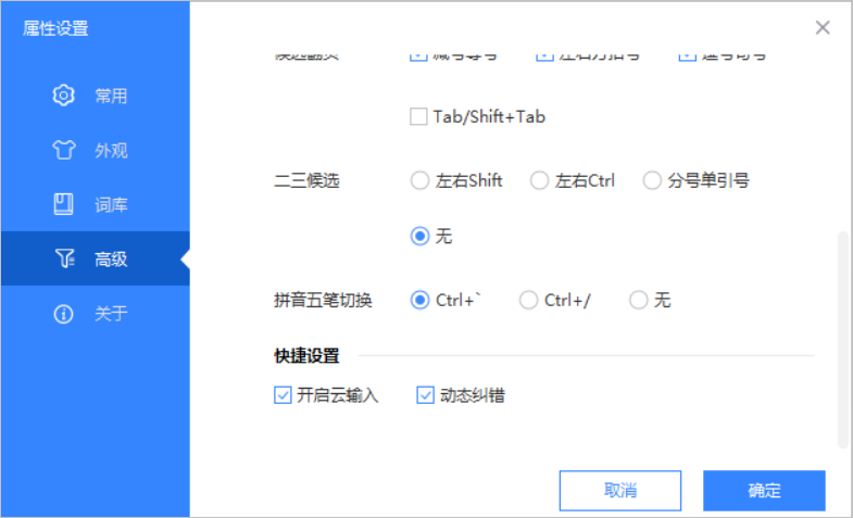 在高级设置里面可以设定输入法功能切换的快捷键方式,另外也可以开启云输入功能,方便你打出互联网上的一些热词。