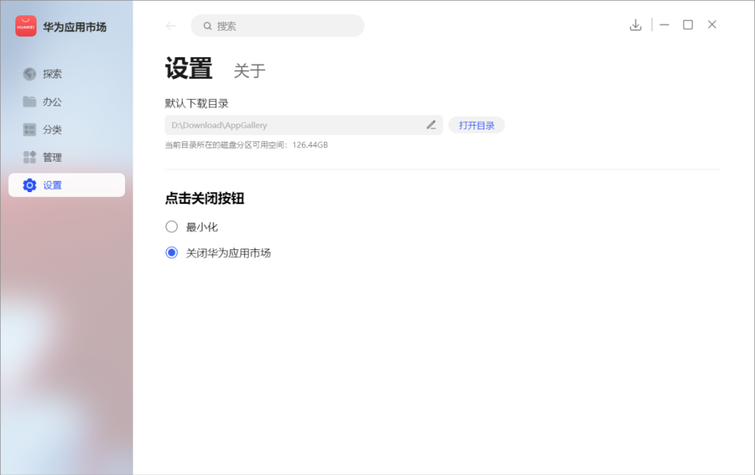 软件的下载目录也可以设置,默认是下载到D盘的 Download\AppGallery 文件夹,另外值得赞的一个小细节,默认是点击关闭按钮,关闭华为商店,不像其它某某的软件商店,默认会常驻在后台。