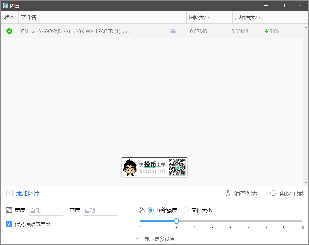 如果对压缩的图片大小结果不满意,可以再次调整压缩级别、点击 “再次压缩” ,算是一个不错的贴心小设计。
