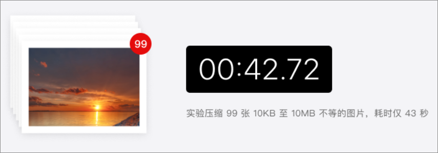 然后就是压缩速度,「图压」官方称实验压缩 99 张 10KB 到10MB 不等的图片,耗时 43 秒。实际上压缩速度也跟你电脑硬件配置情况也有一定关系。