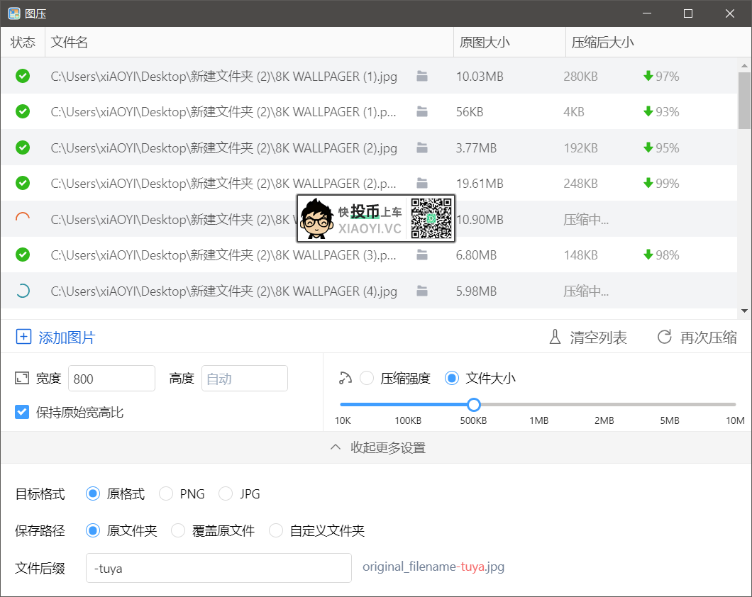 你可以调整压缩级别以及文件大小。在压缩图片后,会显示压缩后的大小以及压缩率,输出的图片也会自动重命名,避免覆盖到原图片。