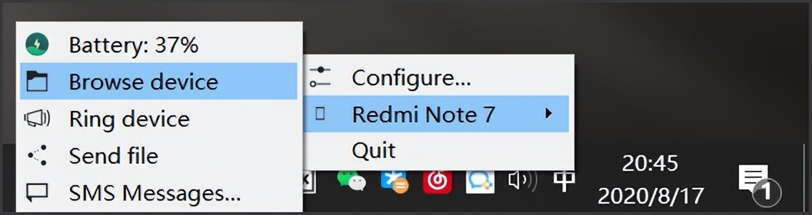 文件传送:从电脑上传送文件到手机上,任务栏的「KDE Connect」图标右键,选择 “Send file”,菜单里也可以发送短信消息到手机上,查看手机电量。