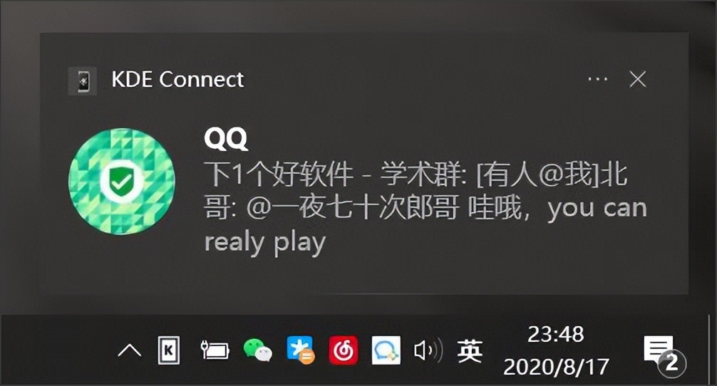 消息通知:在 PC 上可以接收到手机端的应用消息通知,可以在手机端的「KDE Connect」里的设置可选需要推送通知的应用。经过测试微信好像没办法通知,QQ就没问题。