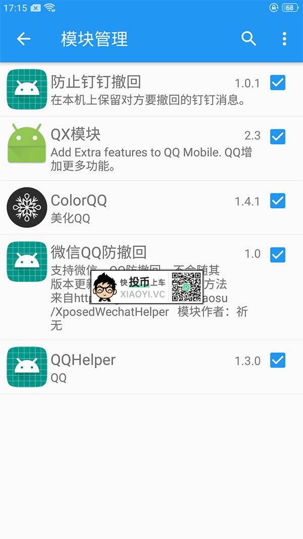 4.模块安装完毕后,需要在模块管理里面激活,雷锋哥安装了一些常用到的模块,你懂的。根据每个模块不同的特性,有的 APP 中会增加设置入口,有的则需要打开模块程序修改设置。