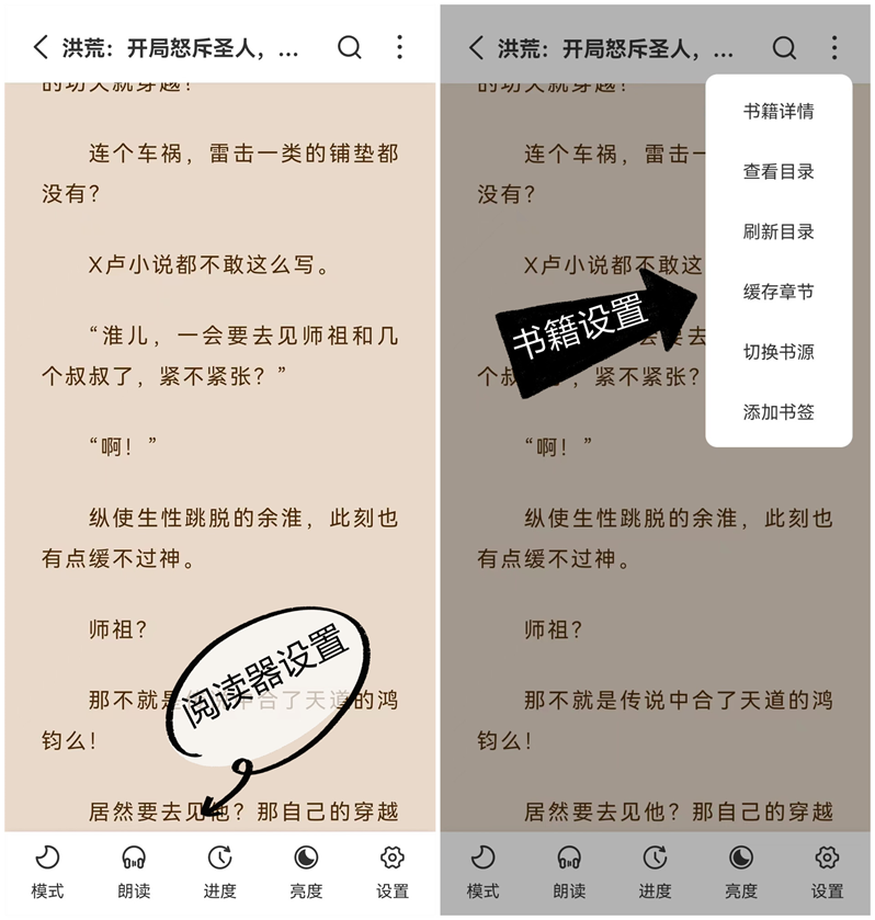 右上角还折叠了切换书源、目录查看、缓存章节、添加书签等功能,使用体验很好!