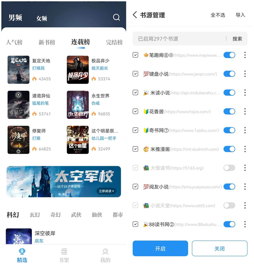 海鱼小说是一款书源聚合类阅读软件,它精选了297个优质书源,相对于阅读的导入书源,海鱼的自带书源体验感就不错,并且书源确实挺优质。