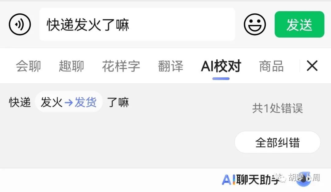 比如 AI 校对,在聊天中可以有效避免错别字,在完成文字输入后,再点击 AI 校对查看一下,有错别字就会提示。