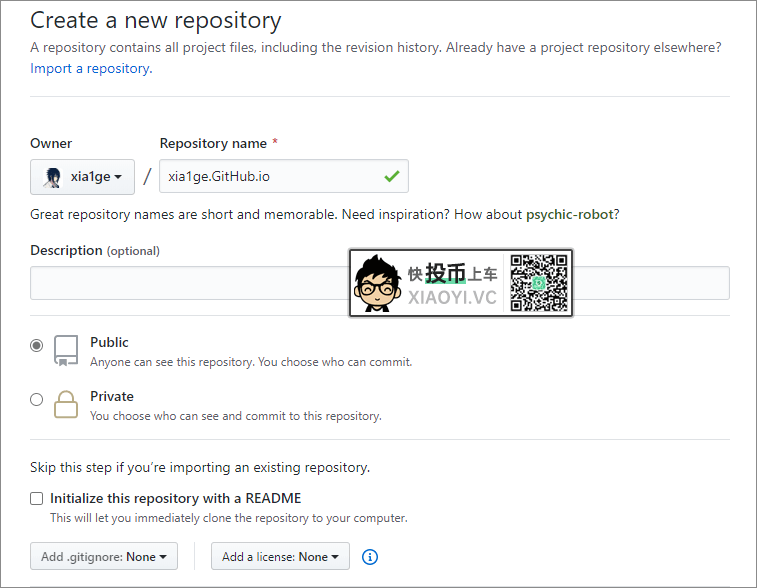 3.在 Repository name 输入你的仓库地址:你的名字.GitHub.io,再点击下面的 “Creating repository” 按钮创建。