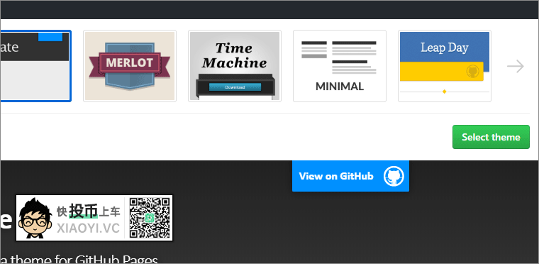 6.GitHub 提供主题不是很多,问题不大,后面也可以自己折腾样式修改主题。随便挑一个,点击 “Select theme” 选择。