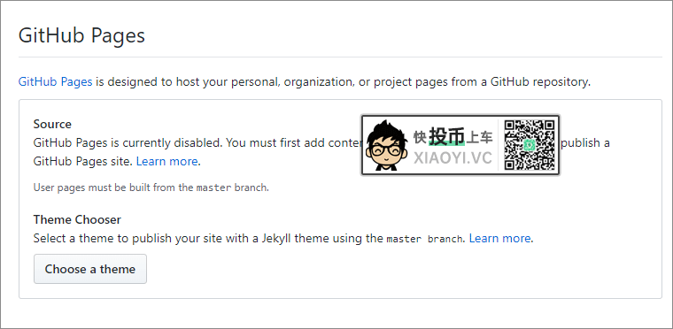 5.进入设置页面,往下拉,找到 GitHub Pages 点击 “Choose a theme” 然后选择一个主题。