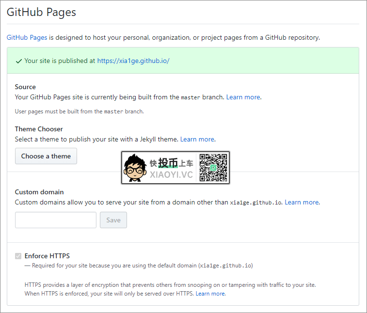 再次进入 “Settings” 设置界面找到 “Custom domain”,看到 “Your site is published at http://blog.xiaoyi.vc” 证明成功了,需要HTTPS的模式,可以勾选下面的 Enforce HTTPS,然后等待证书生效就行了。