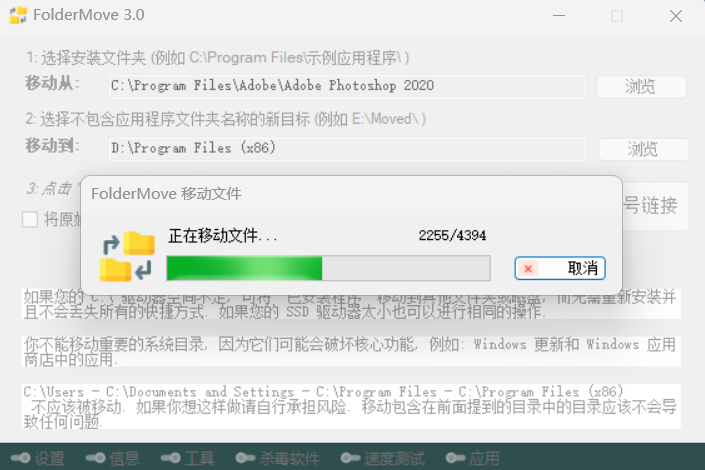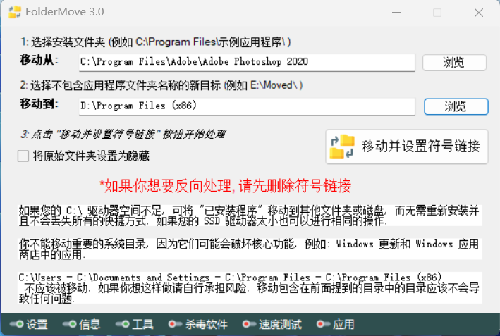 不过 FolderMove 的文件夹迁移方式和传统的复制剪切有着天壤之别,迁移之后的文件夹所在软件安装程序依然能够正常运行和使用,也不会影响软件性能,这是简单的复制剪切所做不到的!