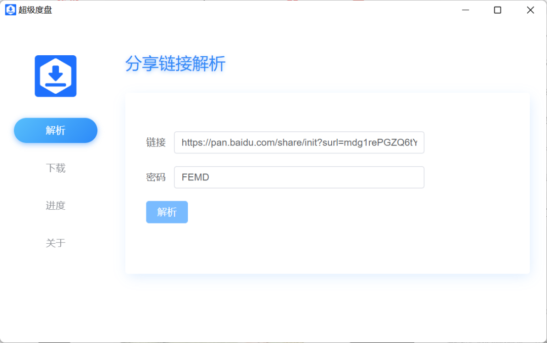 如果要下载度盘资源,可切换进入解析页面,然后粘贴你需要下载的度盘资源链接和提取码,再点击解析按钮即可。