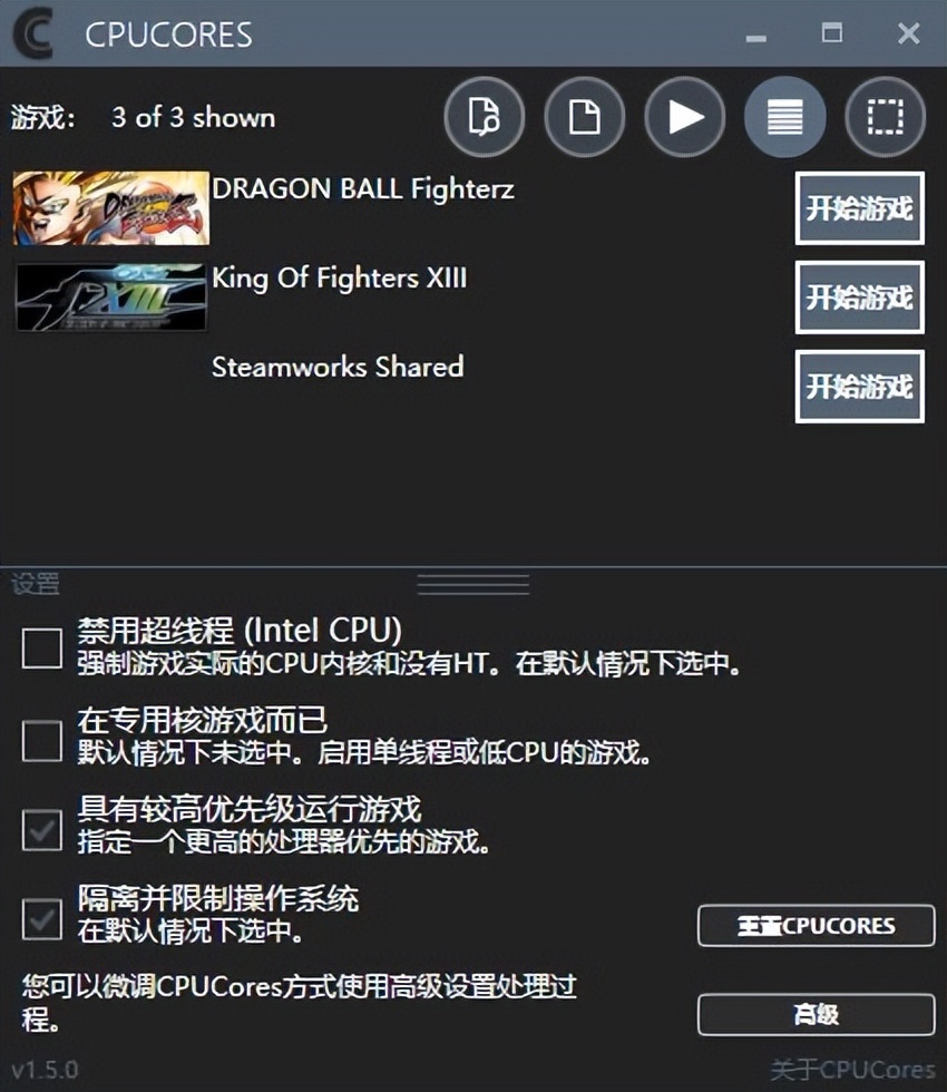 运行「CPUCores」后就会自动读取你的Steam游戏,也可以手动添加游戏,默认直接点开始游戏,就会自动优化帧数。