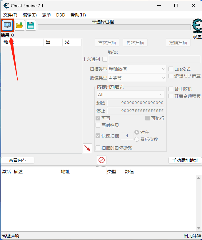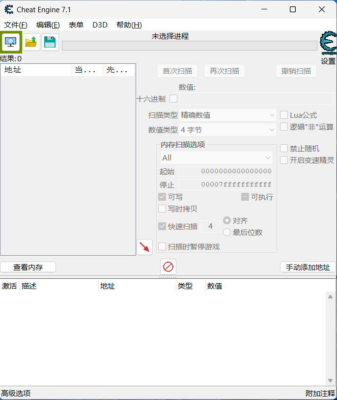 双击运行 Cheat Engine.exe 主程序开启软件,点击左侧查找按钮,可以查看当前正在运行的程序进程。
