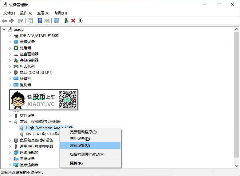 3.卸载你的声卡驱动:快捷键 Win+X,设备管理器 → 声音、视频和游戏控制器,选择你的声卡驱动,右键 “卸载设备”。(这时候会提示你重启,先不要重启哦)