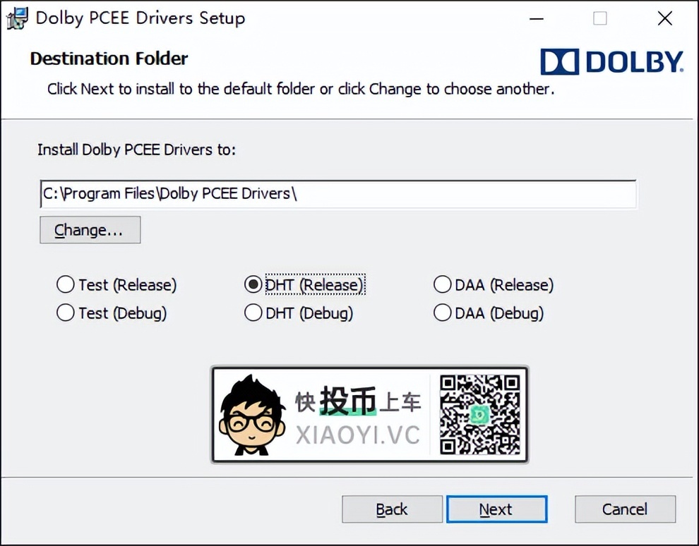 8.运行 C:\DRIVERS\WIN\DOLBY\x64\Drivers.msi 安装(如果你是32位系统,就进入x86目录)看到下面的安装界面,选择 “DHT (Release)” 。注意了,这里先不要点 “Next”。