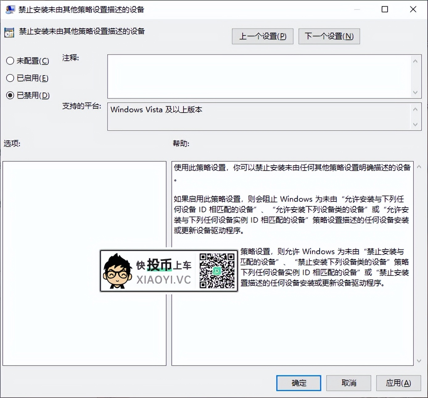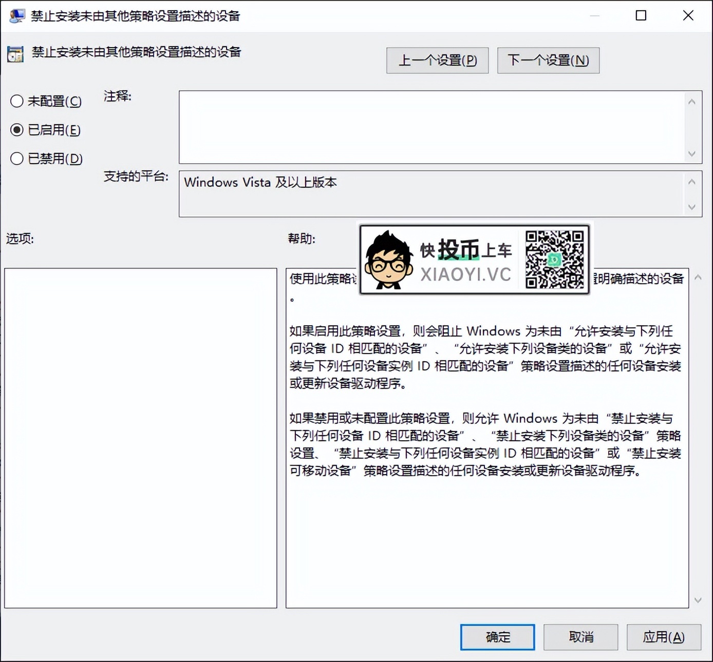 9.重新点开 “步骤6” 的 “禁止安装未由其他策略设置描述的设备” 界面,点击应用。