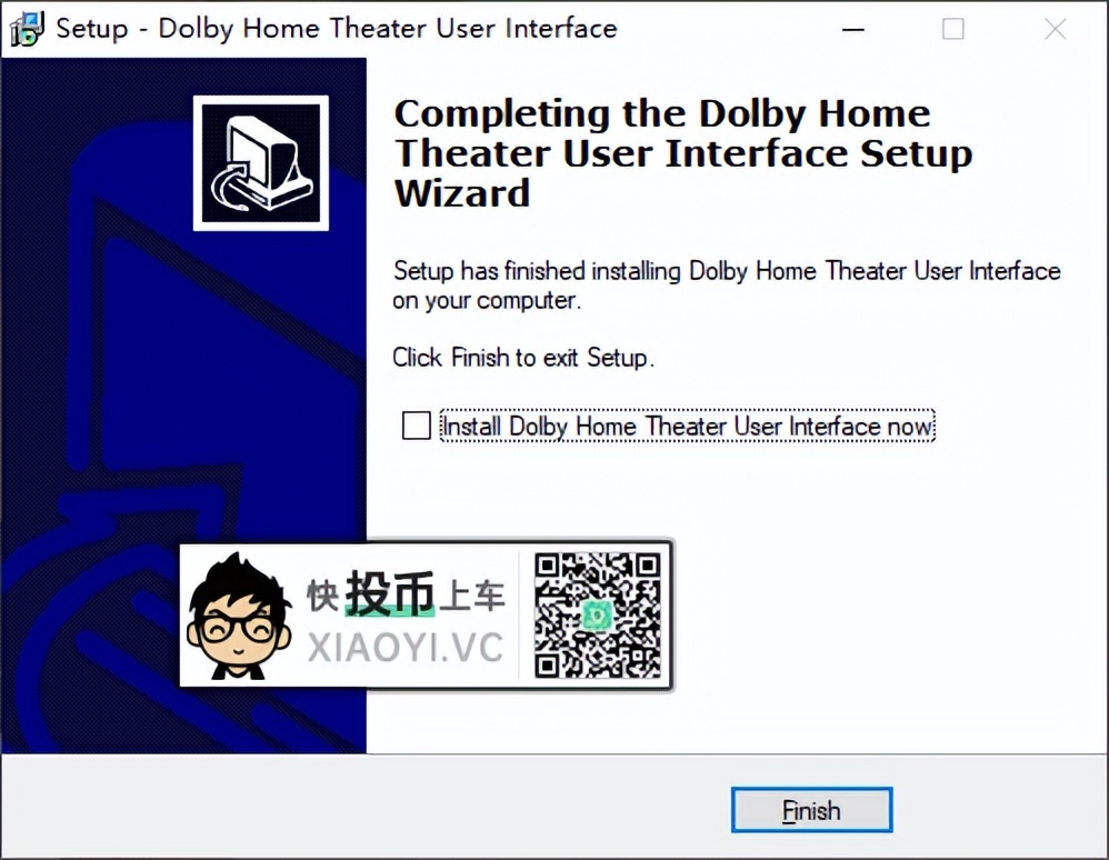 7.安装你下载好的杜比音效安装程序,自动会解压到 C:\DRIVERS\WIN\DOLBY 目录。等到出现下面的界面,一定要 勾选掉 “Install Dolby Home Theater User Interface now” 然后点击Finish。