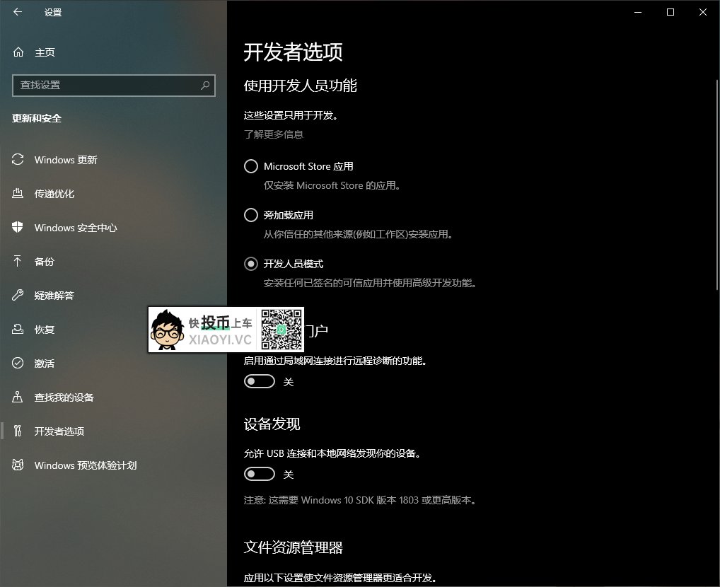 1.快捷键Win+X,设置 → 更新与安全 → 开发者选项 → 选上“开发人员模式”