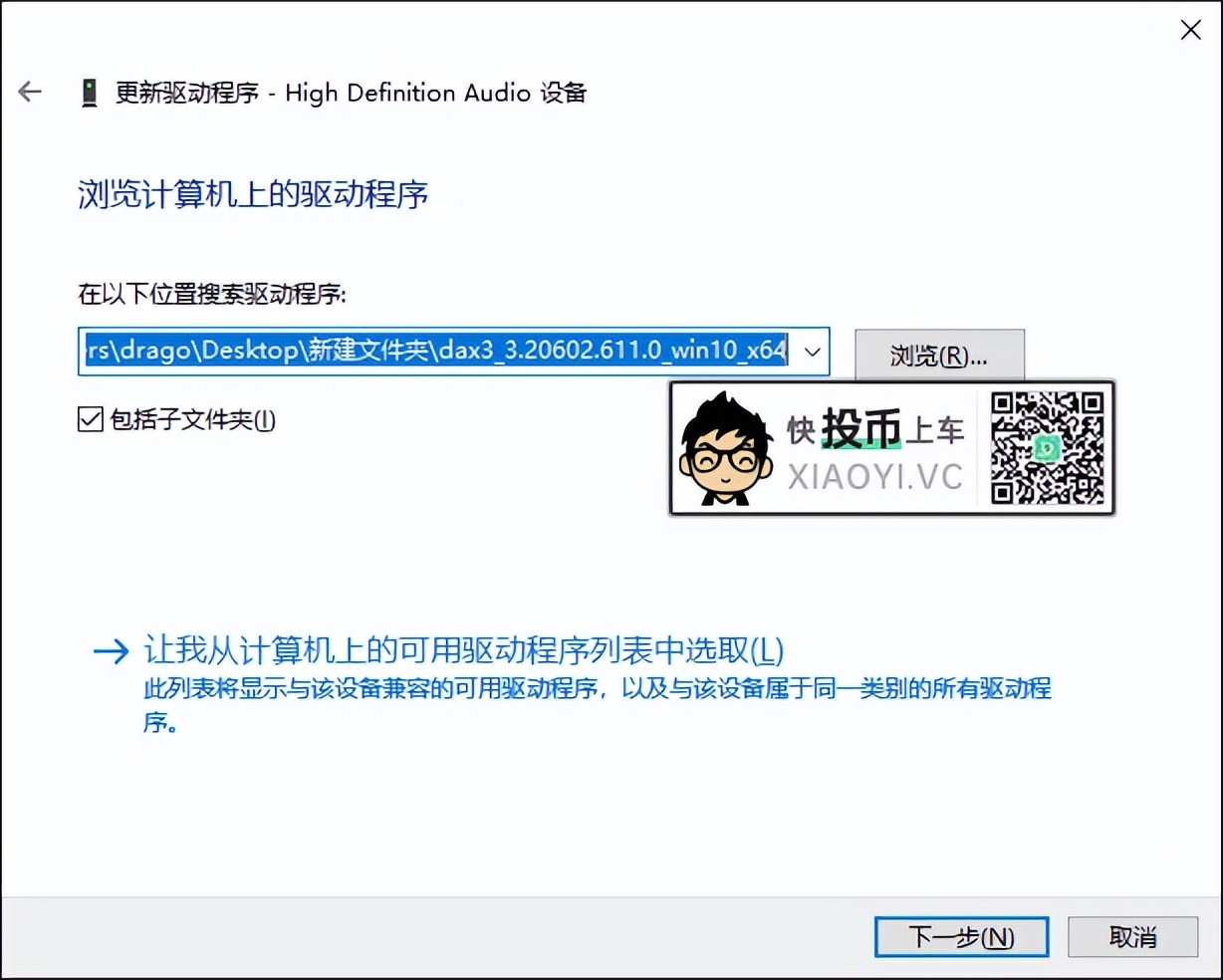 5.点击 “让我从计算机上的可用驱动程序列表中选择”,再点击从磁盘安装,选择驱动文件夹里面的 “hdaudio.inf” 文件。