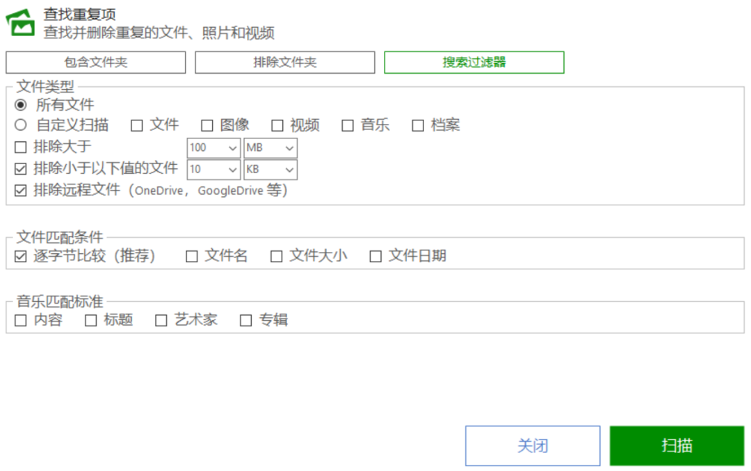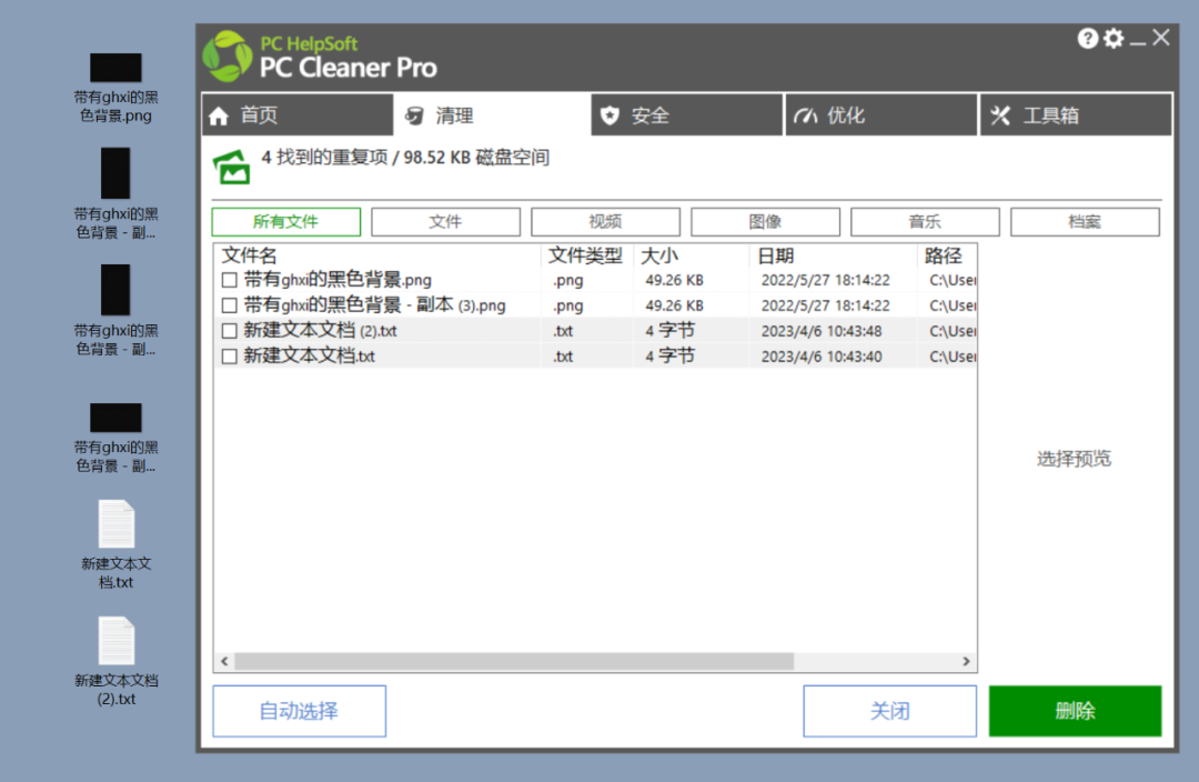 在清理重复内容方面,简单测试了一下,它可以简单对比重复的文件,两个文件字节一样的时候就算是重复的文件,旋转或者修改一下,相似的文件是找不出来的。