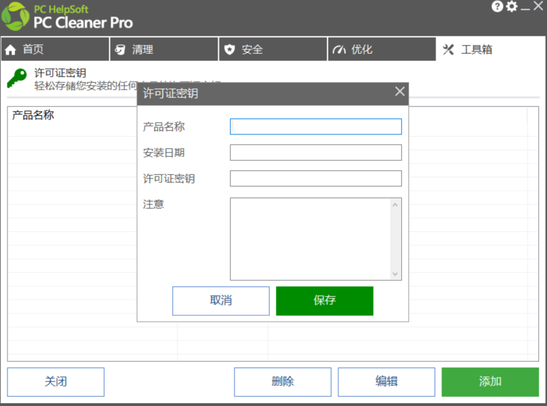 除了文件加密,PC Cleaner还有一个类似密码管理器的软件密钥管理工具,虽然就是一个简单的文本存储功能,但也能感觉出来这小工具想得挺全。