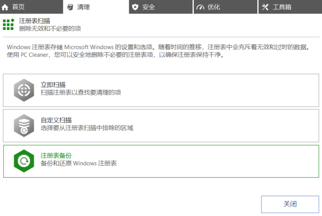 它能管理注册表,注册表建议小白不要乱动,清理错了可能出现意料之外的问题,即使需要清理也记得要先备份一下,在这个工具里可以清理或备份。