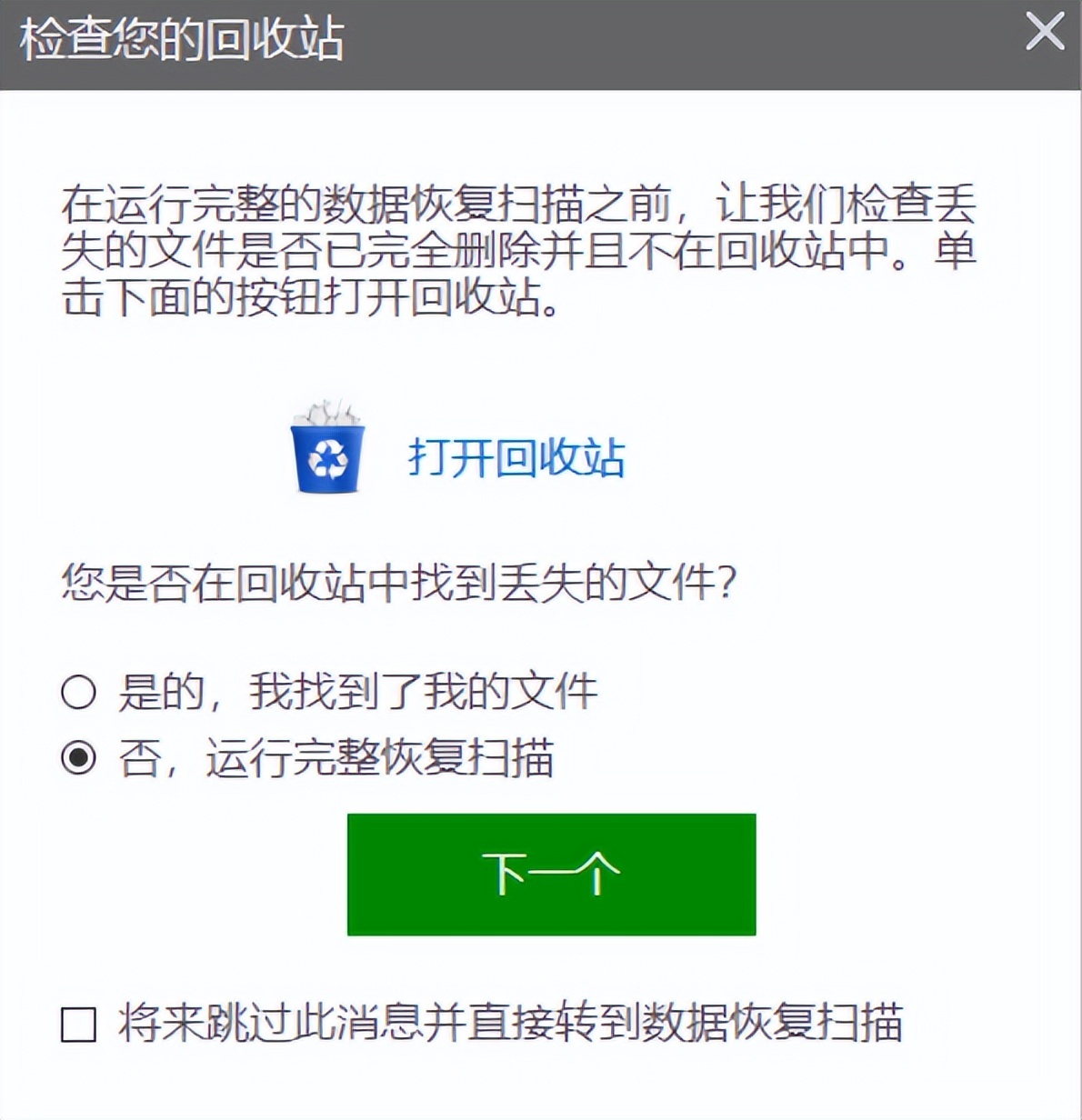 用这个功能的时候它还会贴心提示你:让我们先去回收站找找…好家伙,还贴了一个大大的按钮帮你跳转到系统回收站,这防呆设计可以的。