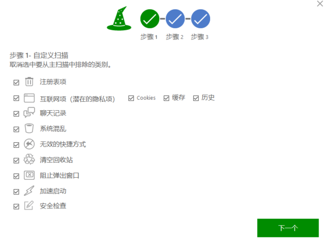 首次使用会有个使用向导,需要勾选一些清理的选项,这个稍稍有点繁杂可以直接关掉,自己手动清理。