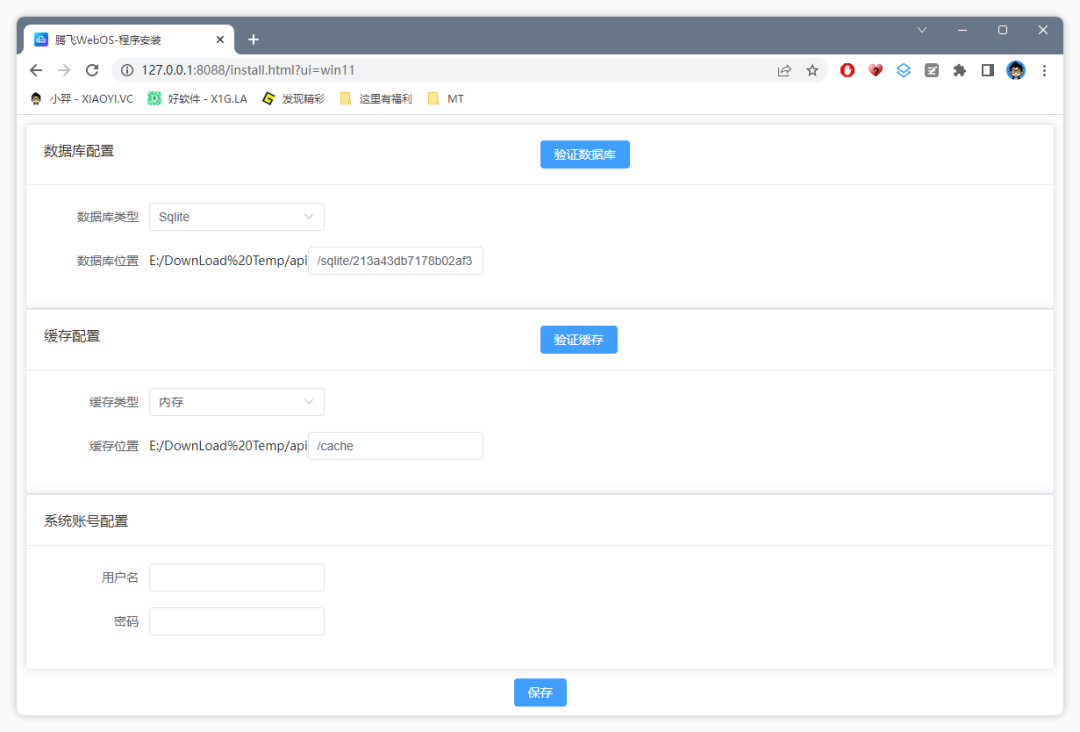 然后浏览器访问 127.0.0.1:8088,点验证数据库和验证缓存,接着输入用户名和密码,点保存。