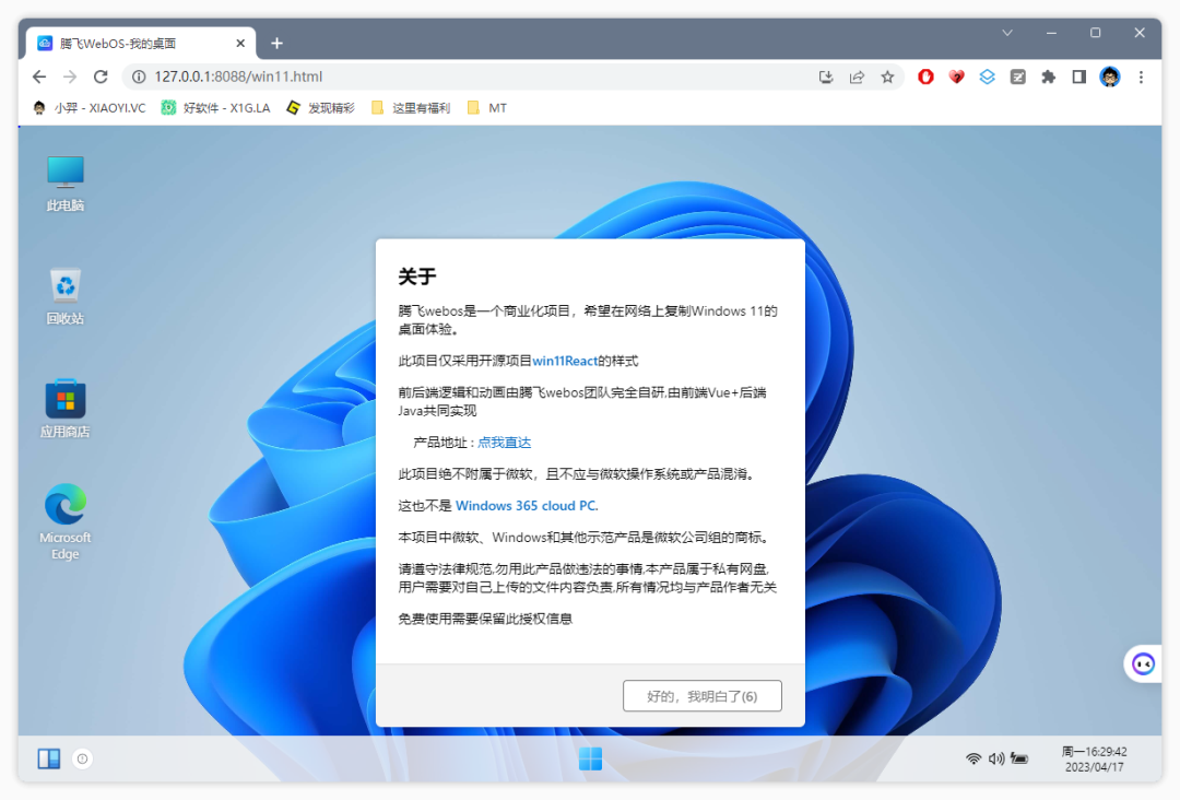 进入「WebOS」主界面后可以看到它采用了 Win11 的设计风格,根据介绍是使用了 win11React 项目的样式。