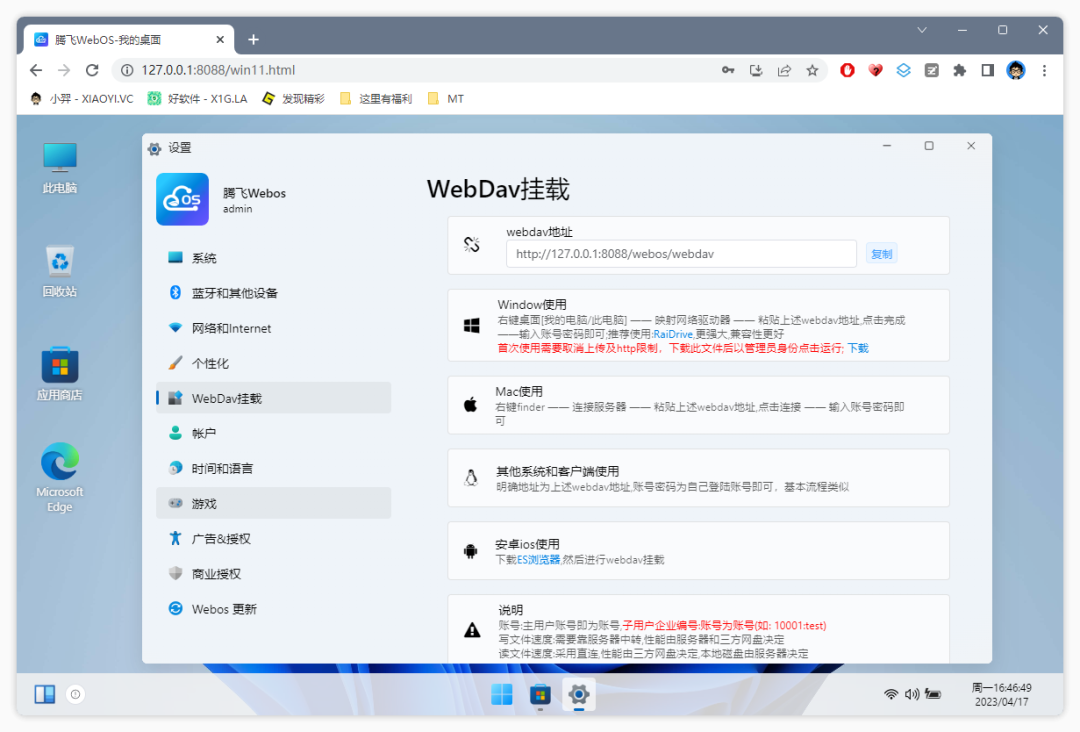 功能设置方面也采用 Win11 的风格,提供支持了系统账号、网络端口、Webdav挂载、界面样式、授权等设置。