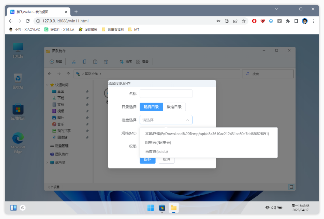 另外还支持团队协作功能,选择你已建立的本地磁盘或者网盘,支持设置随机目录、指定目录、相关权限功能。