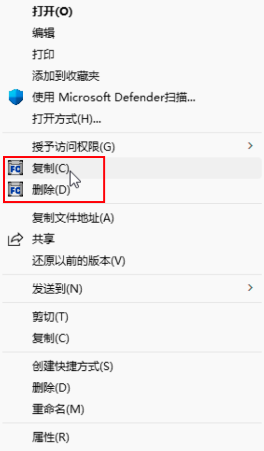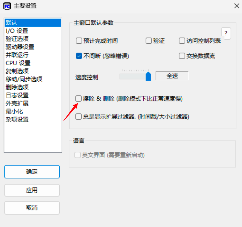 上图中我们还可以看到,启用了外壳扩展后,右键菜单还多了一个“FC删除”,使用它删除的文件不进回收站直接删掉,此外还可以通过设置,将删掉的文件防止恢复。主要设置中,勾选下图中的“擦除&删除(删除模式下比正常速度慢)”,默认情况这里是未勾选状态。