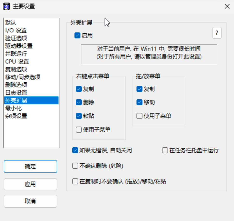 我们可以对软件做一下简单的设置,点击主菜单中的“选项”-“主要设置”-“外壳扩展”,勾选“启用”,这样就可以直接在右键菜单中使用“FC复制”,自动弹出窗口并自动把路径填写到“源”中。操作起来非常的方便,目标位置还是要手动拖一下。