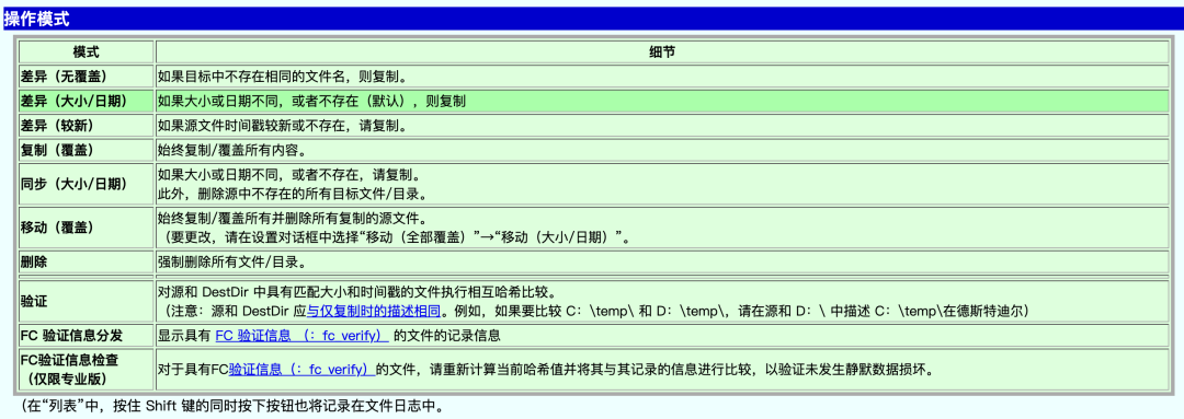 这几种操作模式,我们可以看一下官网的介绍。在复制文件的时候可以把文件(夹)的修改日期一并复制过去、同步文件等等,非常的方便。